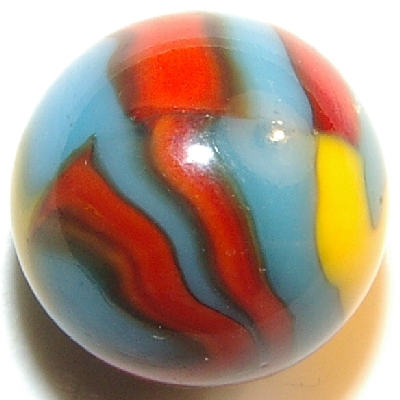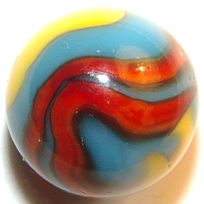 Here is one of the most collectable marbles in the machine made world. A Peltier NLR Superman. There are two bright ribbons of yellow and four brilliant red ribbons, trimmed in black, meeting at two seams on opposing ends of the marble. at 45/64", the size is actually a little over 11/16".