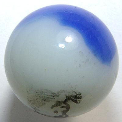 This is Peltier Comic picture marble with the image 1920s comic strip charactor SKEEZIX on white marble with a royal blue patch. The actual size is just a thin hair less than 11/16, the fat half of 43/64.