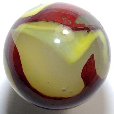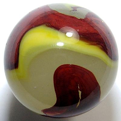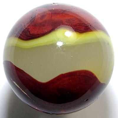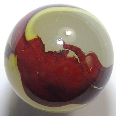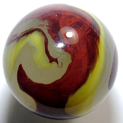 This is one of the richest applications of OXBLOOD I've ever seen and far exceeds the EGGYOLK that tries to follow it on the surface of the translucent cloudy base glass indicative of the ACE family of Akro marbles.