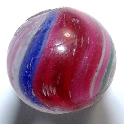 I'm really not sure about what to call this one. An onionskin is described as a thin layer, "skin", of a color, usually white or yellow completely surrounding a clear marble, on top of which are lines, bands, spots, or streaks of a more vivid color. With this marble, some of the pink bands are lying on top of white bands, while the red, blue, and green are there by themselves, but they are separated by clear streaks that allow you to see inside of the marble in the manner of a Joseph's Coat. I guess the owner can call it whatever they like.