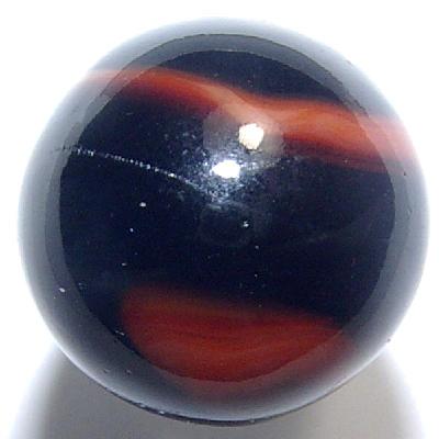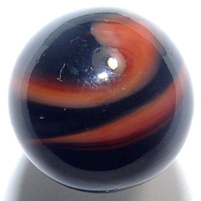 Beautiful jet-black base glass with a blend of red and orange corkscrew that makes two full turns in a meandering course from pole to pole.