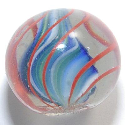 I hate to be so repetitive about these PeeWees, but still, I am continually amazed at the skill it took for these 19th century glass artists to produce such a detailed work as this in such a small size. At the core of a crystal clear, less than 1/2", marble, the maker has managed to combine multiple ribbons of blue, green, white and teal into a nearly perfectly formed solid core, and then surrounded the whole thing, on the surface, with four sets of equally space red lattice lines that has left us with a piece of eye-candy to marvel at for well over a century.