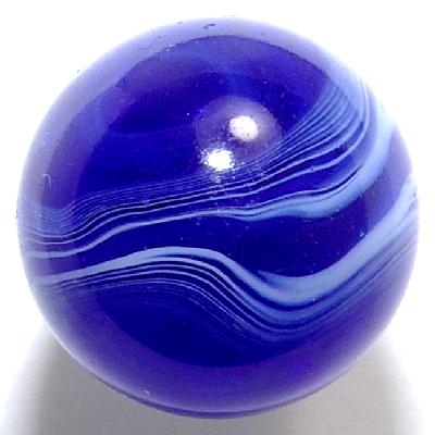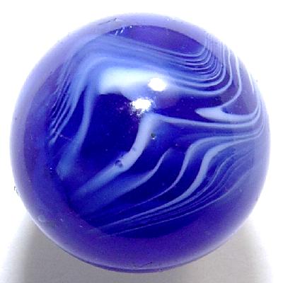Here is a gorgeous translucent dark cobalt blue marble with the famous Peltier feathered white swirls surrounding the circumference and showing two cutoff seams. These are some of Peltier's earliest efforts when they entered the marble making business way back in the early 20th century.