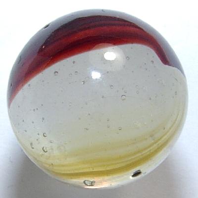 Here is one of Akro Agate's very rare productions: a CLEAR OXBLOOD patch. There is a very nice dark anemic OXBLOOD pach running from seam to seam on a bubble filled clear base glass. There is also a light streak of EGGYOLK showing in the pictures. So, I guess you could call it a CLEAR EGGYOLK OXBLOOD-- unprecedented.