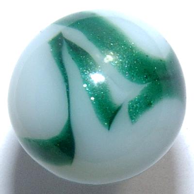 SHIMMERING is certainly the right word to describe these AVENTURINE filled SPRUCE green swirls that run on and through this white Alley Agate marble. There is also a small amount of clear. The amount of aventurine is phenomenal--almost like a view of the galaxy on the clearest of nights.