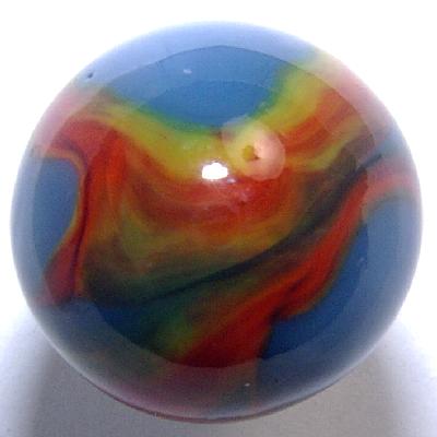 Here is one that run into now and again as I'm looking for West Virginia marbles. This is from one of their biggest and most successful companies: the Alley Agate Co., this example, with red and yellow swirls on a blue base glass, is known to collectors as the SUPERMAN.