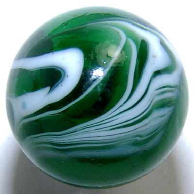 The transparent dark forest green base glass supports the classic feathered, almost rooster tail, design that makes Peltier slags so easy to identify, the only marble of it's kind ever made. They can still be found even with the large influx of marble collectors into the community; however, most found today have been played with quite a bit, and very few are around in this like new wet mint condition.