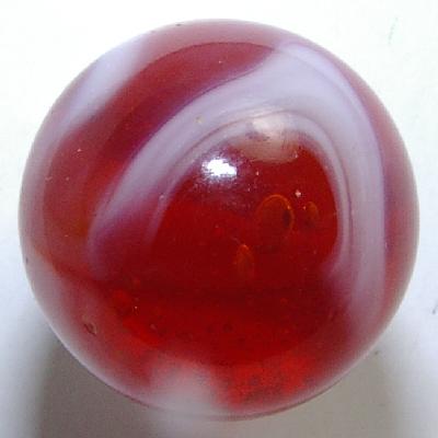 When you come across transparent red as the base glass of a Peltier marble, you have found a rarity indeed; such as the Rainbo Ruby Slipper. The Ruby Slipper though is a very dark Ruby red glass, and this one is a bright transparent CHERRY red that allows you to see down inside the marble. I've seen far and away more of the Ruby Slippers than I have of these CHERRY BOMBs, if that's the right name for it. It seems I saw one a few years back that had that name on it. I said all that to say this: The CHERRY RED base glass is a very rare find, and for it to be in this wonderful mint condition makes it a great day indeed. CONDITION: MINT 9.6 The surface is wet and shiny as a mint marble should be, and there is no sign of play or wear. All I can find under close inspection is a number of very tiny and clearly as-made melted dimples. You may click here to view the grading system I use. Size 16.12mm or 0.634" at the equator. | |||||