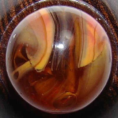 Here is one of the most sought after marbles in the collecting world: the CAC STRIPED TRANSPARENT SUBMARINE. There are brilliant colors of pink, electric yellow, and some red meeting at two opposing seams, on the surface of and inside of a beautiful and exceptionally rare, for Christensen, AMBER base glass. To bring out the pattern and colors of this exquisite gem, I have shown the normal six views, i.e. each seam and four quarter-turn rotations, on a white background, another six views on a dark background, and two views of the seams with backlighting. All of this demonstrates that there isn't a bad view available, and that no matter how you look at this marble, it's captivating excellence further demonstrates why Christensen Agate marbles are the finest in the world.