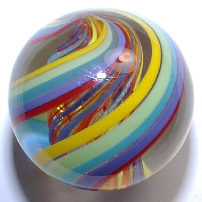 This gorgeous beauty is unsigned but there is no doubt in my mind that it was made by one of the day's most exemplary artists: JODY FINE. There is so much going on in this marble that it's really hard to describe. It appears, to me, to have a red latticinio web in the inner core that is immediately surrounded by another latticinio web of wider lattice lines of many colors including: royal blue, powder blue, chartreaus yellow, yellow, two distinct oranges, and a purple; some of these are covered with bubbles from pole to pole. Then, on the surface are wide rainbo bands made up of the same colors as the those inside. Simply a breath-taking example of one of today's finest glass professionals.