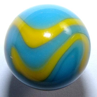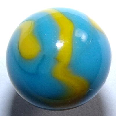 Bright canary yellow ribbons swirl staggeringly to meet at two seams on a robin's-egg blue base glass to form the well known and popular Peltier NLR "CUB SCOUT". This beauty sports exceptionally bright colors and a striking pattern providing it with lots of eye-appeal, as well as almost unheard of high mint condition for a highly prized, top end collectors dream.