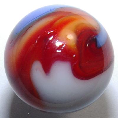 Most MILLER machine output was transparent glass with only a few opaque. The combination of red and yellow on an opaque white base glass describes the Peltier KETCHUP and MUSTARD. Red and blue ribbons on that same white base glass make up the well-known LIBERTY. With both of these definitions on the same marble, we have, as the title says, a HYBRID K&M/LIBERTY. The production of shooter-size marbles was severely limited. The diameter of this example measures 23/32", indeed SHOOTER size. So, we have shooter-sized Miller machine marble with red, yellow, and blue swirls on an opaque white base glass. It appears we have covered the rarity of this marble from all points, but the icing on the cake is the beautiful mint condition of this 100-year-old sweetheart. CONDITION: MINT(+) 9.7 The surface is exceptionally glossy wet, and shiny, with absolutely no sign of wear of any kind. There are some creases at the joining of colors and a few tiny melted dimples from collapsed near-surface air bubbles. You may click here to view the grading system I use. Size 18.21mm or 0.716" at the equator. | |||||