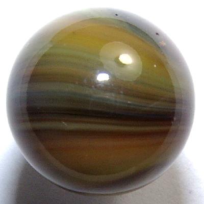 Sometimes, the more you look at a marble, the more difficult it becomes to describe, probably because closer inspection reveals more details. This old Master Made SUNBURST is a prime example of this phenomenon: Initially, half of the marble shows some earth tones on a translucent reddish base glass. But while photographing and inspecting for condition and description purposes, I notice veins of yellow, blue, and green dispersed among many diverse tones of brown, from tan to chocolate. The opposite side shows a transparent amber glass covering the backsides of the veins of the earth tones listed above. Some red ribbons and veins can be seen as the cause of the red tint to the transparent amber.