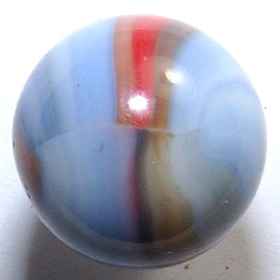 Considering PATCH & RIBBON marbles: Originally, the P&R marbles were straightforward two-color marbles. The first patch was of one color, and the first ribbon was adjacent to the first patch and of the other color. Then, a second ribbon of the first color was applied contiguously to the first, followed by a patch of the second color. The ribbons meet each other precisely on the surface at two opposing seams. This example, dubbed the "ROBIN EGG," has more color in one ribbon than some of the old-style had in total. The first patch is primarily powder blue with some bands of darker or lighter similar hues. The first adjoining ribbon includes bands of tan, red, and what looks like OXBLOOD. Next, another ribbon: this marble has a wide swath of diverse shades of blue. A red patch follows that for the finale. CONDITION: NEAR MINT(+) The surface is shiny but not quite as much as it could be. I don't see any sign of playtime, and it certainly hasn't seen any of the games played in the dirt. Still, with magnification, I can see light pocket wear. You may click here to view the grading system I use. Size 16.46mm or 0.648" at the equator. | |||||