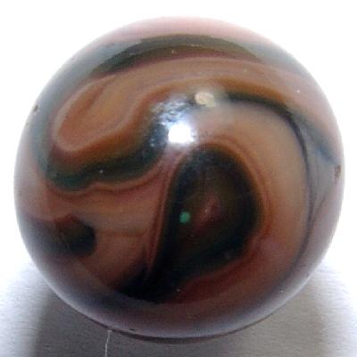 Here is a popular and exceedingly hard-to-find marble of the West Virginia Swirls genus and one of the RAVENSWOOD NOVELTY WORKS most sought-after products: the GREEN RAVEN. Beautiful dark transparent forest green swirls intermingle with blends of brown from chocolate to tan. On the reverse side of the marble, blue swirls mix with the browns, meeting the definition of a BLUE RAVEN.