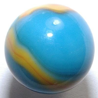 The base glass of this marble is opaque robin's-egg blue. Yellow ribbons traverse the surface of the base and meet at two opposing seams. Each of the yellow ribbons has a red streak right down the center, and I think I am correct here, changing the character definition of the marble from a CUB SCOUT to a SUPERBOY.