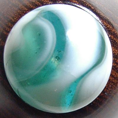 Six ribbons meet at two seams on the surface of a transparent aquamarine base glass. I think the pictures show the aquamarine to be a bit more toward the blue side than the green. Although I didn't even know they were named, I can't remember when I didn't have one of these old POLAR BEARs around somewhere. They were handy for showing the difference between an NLR and a RAINBO. That color is mindful of arctic ice. CONDITION: MINT(-) The surface is wet and shiny without the slightest trace of play or wear anywhere. After a very close inspection with a new 15x loupe, I finally found a short, shallow hairline across the breadth of one of the white ribbons--see near the center of the fifth picture. You can see an apparent open-air hole above that hairline in the center of the fifth picture. There is no hole there; it is all subsurface. You may click here to view the grading system I use. Size 17.36mm or 0.683" at the equator. | |||||